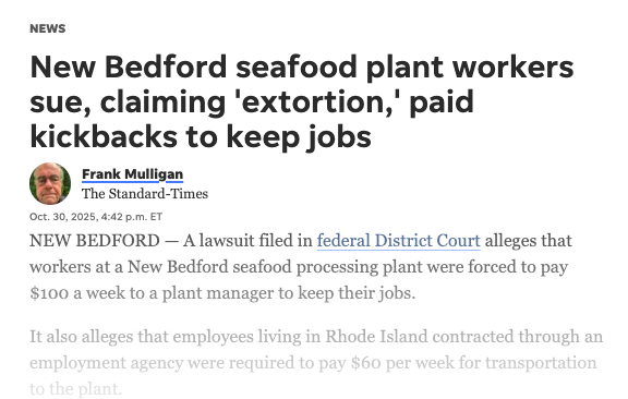 NEW BEDFORD — A lawsuit filed in federal District Court alleges that workers at a New Bedford seafood processing plant were forced to pay $100 a week to a plant manager to keep their jobs.